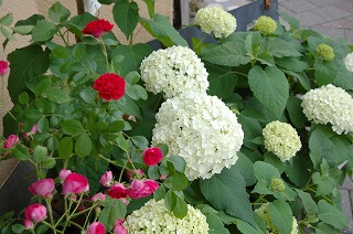 アジサイのアナベル。初夏からさく白い大玉のアジサイです。ほかのものと種類がちがい、日向を好むのもうれしいところ。