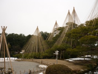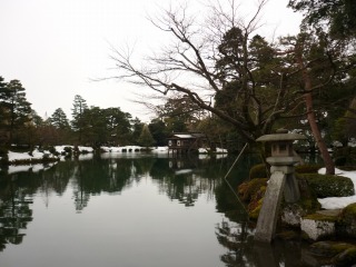 兼六園、徽軫(ことじ)灯籠。(写真左の灯籠です)2本足でたつ、珍しい灯籠で、名物ということですが…。