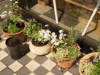 手前の黒いプラ鉢が移植した苗。キレイになりますように!他のよせうえもキレイにできました^^