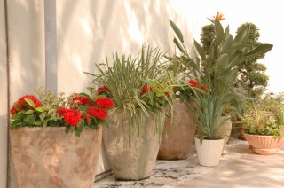 赤い花は、「サンタンカ」といいます。極楽鳥花も咲いてます。