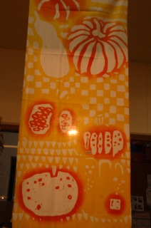 「かぼちゃ家族」という題のてぬぐいです。森ひろこさん、というイラストレーターさんのもの。(緑もあります)