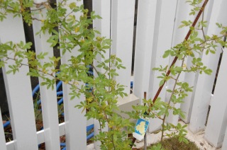 こちらにはバラをたくさん植えました。先日、モッコウバラに蕾が。