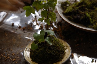 先日つくった苔だま。植える植物はお選びいただけます。(皿つき)