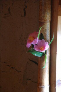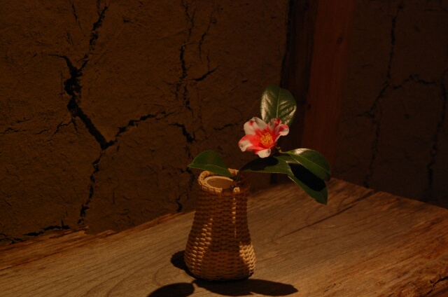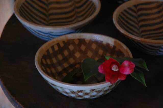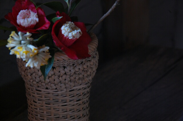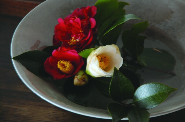 もようが絣のようにみえるからか、素朴な椿が似合います。