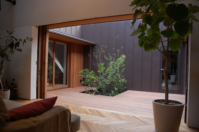 おちついた雰囲気の居間からゆったり眺めていただける、デッキの中の庭。