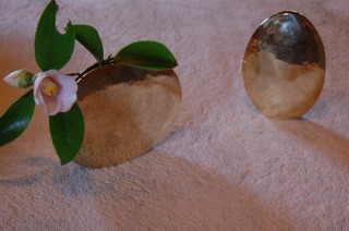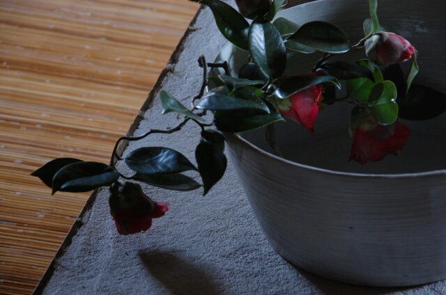 キリッとした濃い色の椿も、ブローチのようになりました。
